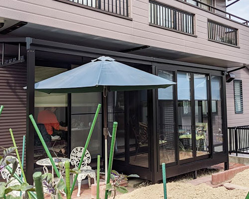 テラスと囲い(YKK製ソラリア関東間3間、屋根F型熱線遮断ポリカ、テラス網戸付き窓、腕木式物干し)